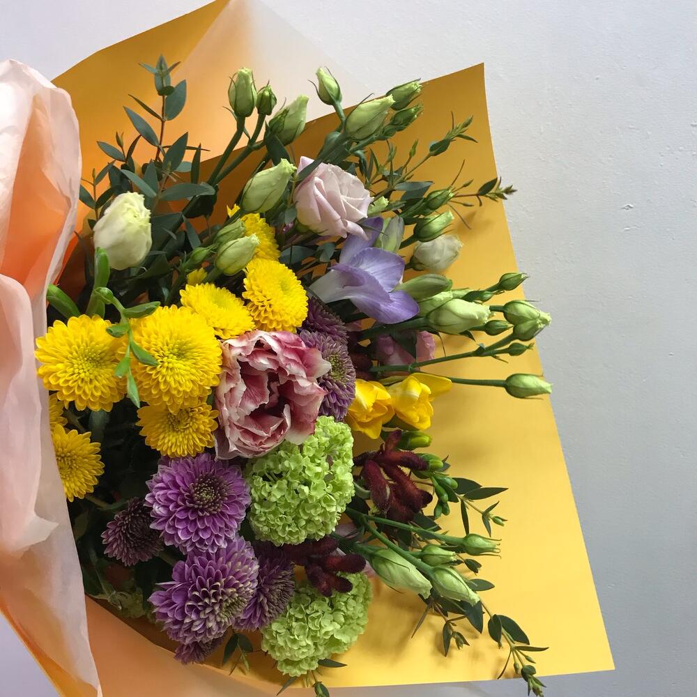 Тюльпан пионовидный - 1 шт.Вибурнум - 1 шт.Сантини - 4 шт.Анигозантус - 1 шт.Фрезия - 2 шт.Лизиантус - 1 шт.Эвкалипт - 1 шт.Упаковка дизайнерская - 1 шт.Лента атласная - 1 шт.Открыточка с вашими пожеланиями - 1 шт.