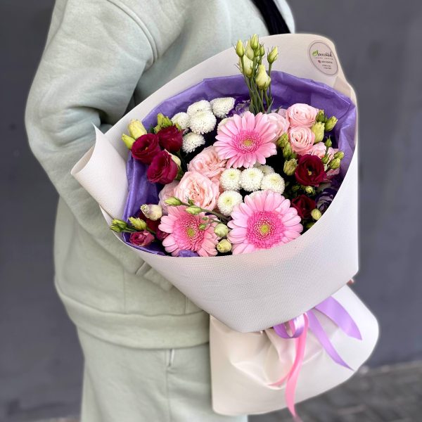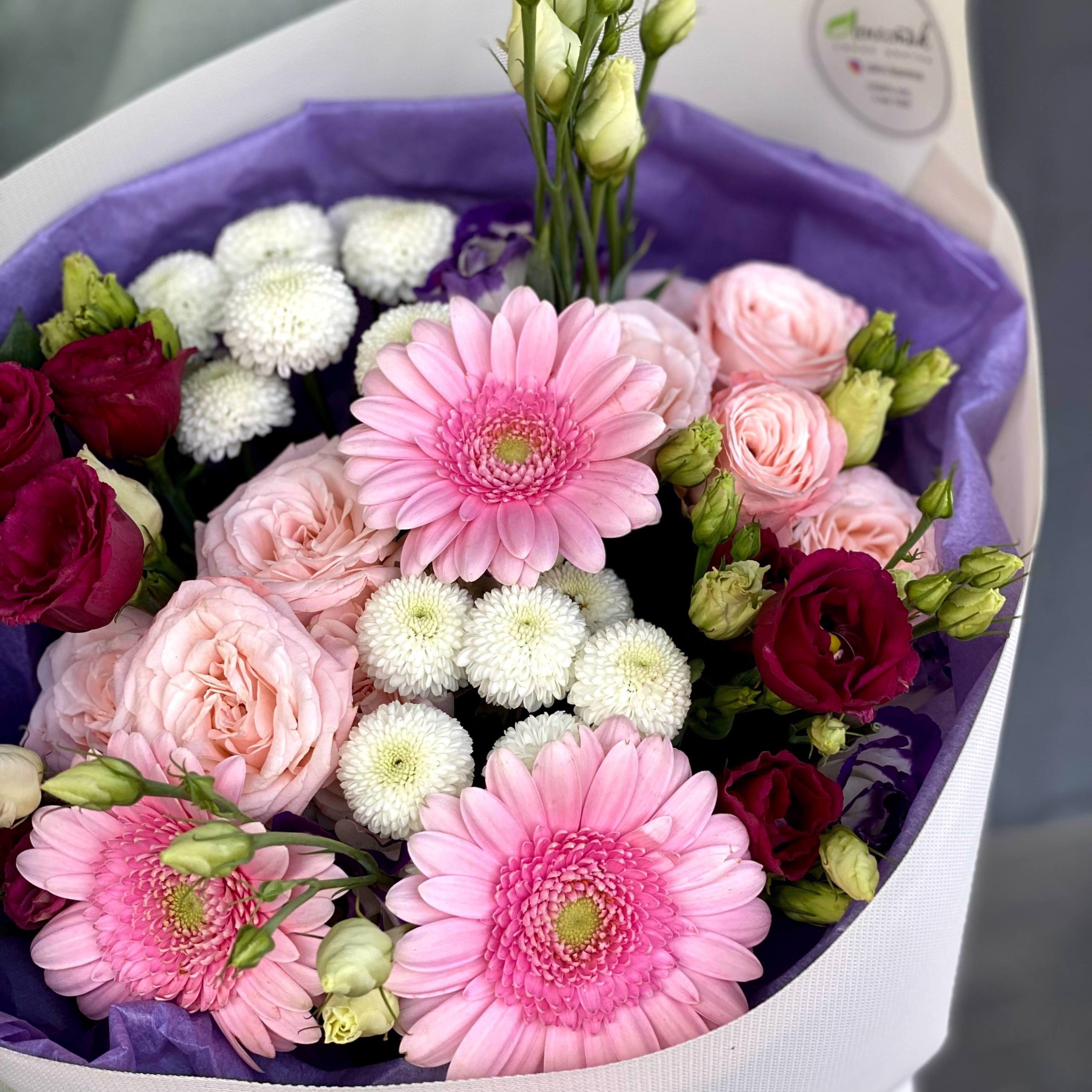 Букет из гербер, бордовой эустомы и хризантемы Ньютон в Гаджиево