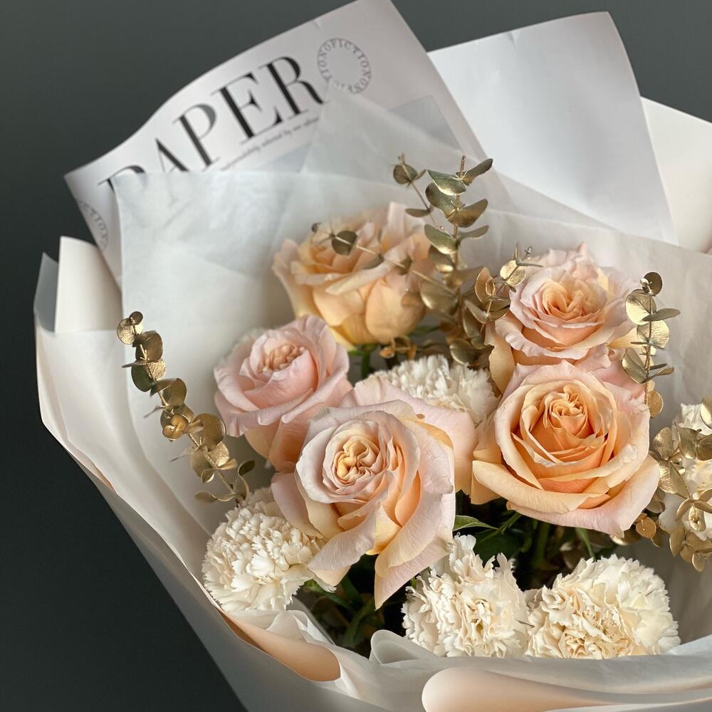 Невероятно стильное сочетание роз и диантусов, которое дополняет дизайнерская упаковка✨
