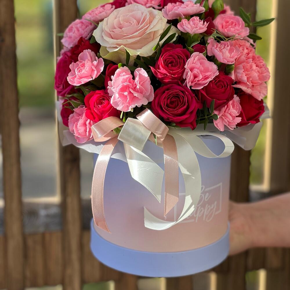 Писташ - 1 шт. Роза кустовая - 2 шт. Роза - 1 шт. Диантус - 3 шт. Коробка - 1 шт. Дизайнерская коробка - 1 шт. Диантус кустовой - 3 шт.